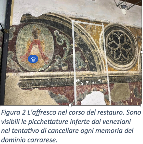 Su proposta dell’Assessorato alla Cultura del Comune di Padova, in accordo con la Direzione dell’Accademia Galileiana, è stato scelto un brano decorativo databile agli anni ’70 del Trecento, che riveste due pareti di un pianerottolo della Reggia. L’affresco riveste una particolare importanza come documento storico artistico per la presenza del cimiero di Francesco I da Carrara e della corona di re Luigi I d’Ungheria, alleato dei Carraresi.