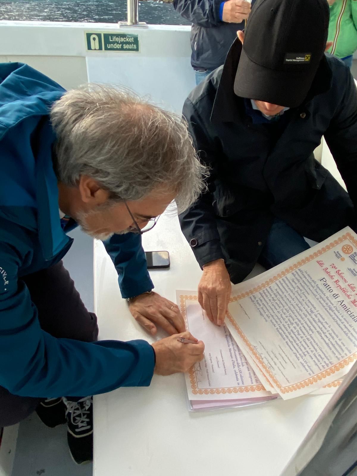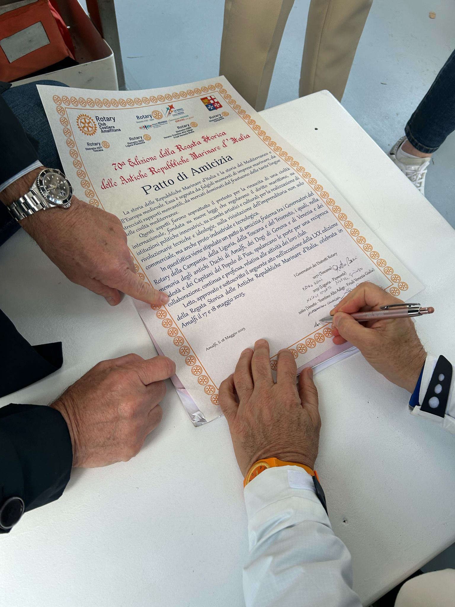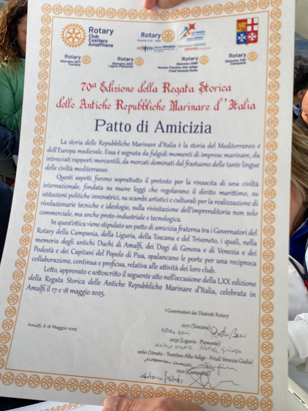 In quest’occasione si è anche siglato il gemellaggio con la sottoscrizione del ” Patto d’Amicizia” fraterna rotariana fra i quattro Distretti Rotary coinvolti (2032, 2060, 2071, 2101). Oltre i Governatori dei Distretti erano presenti anche i Presidenti dei Club delle città delle Repubbliche marinare, per suggellare con maggiore forza il Patto d’Amiciza.