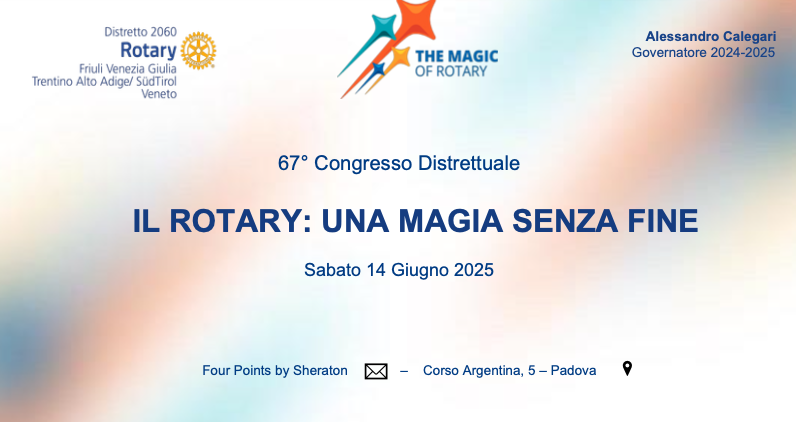 Sabato 14 giugno 2025 a Padova : 67° Congresso Distretto Rotary 2060 L’evento, aperto a tutte… Leggi tutto »13-14 /06/25 – 67° Congresso Distretto Rotary 2060